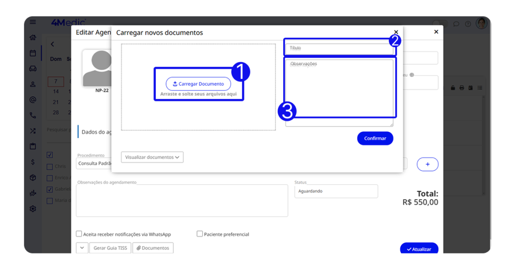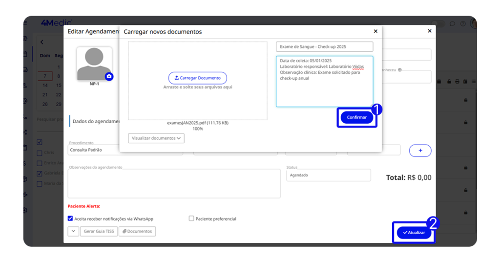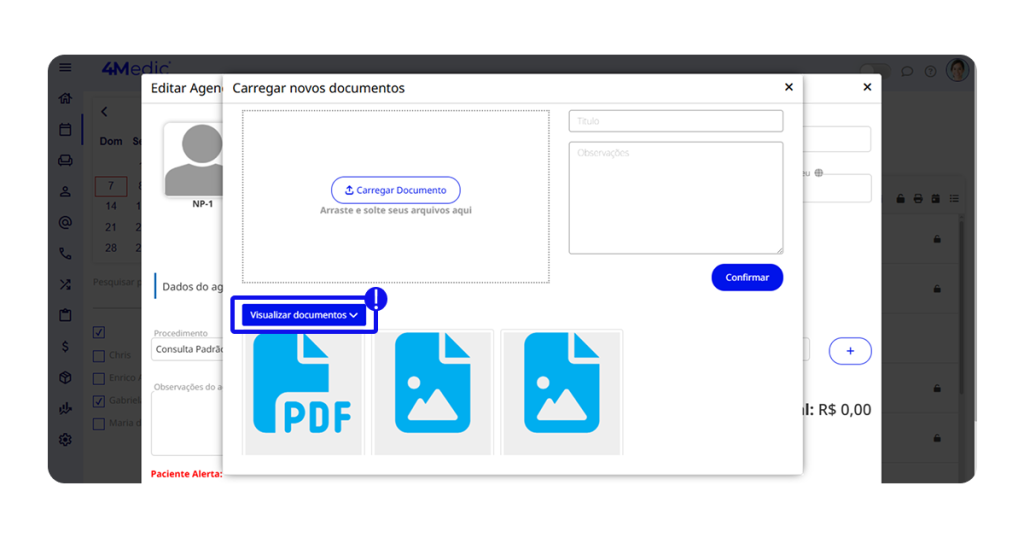 Anexar documentos aos agendamentos é um recurso que permite centralizar ainda mais as informações do atendimento dentro da plataforma. Com essa funcionalidade, você pode incluir arquivos importantes diretamente no agendamento do paciente, como exames, laudos, orientações ou qualquer outro material necessário para o acompanhamento clínico.