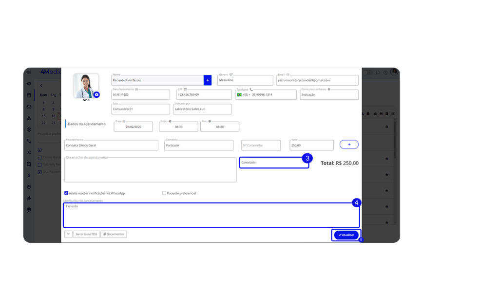 Com esse processo, o agendamento será cancelado corretamente, liberando o horário na agenda para novas marcações, mantendo o histórico de alterações e garantindo mais controle, segurança e organização da agenda.