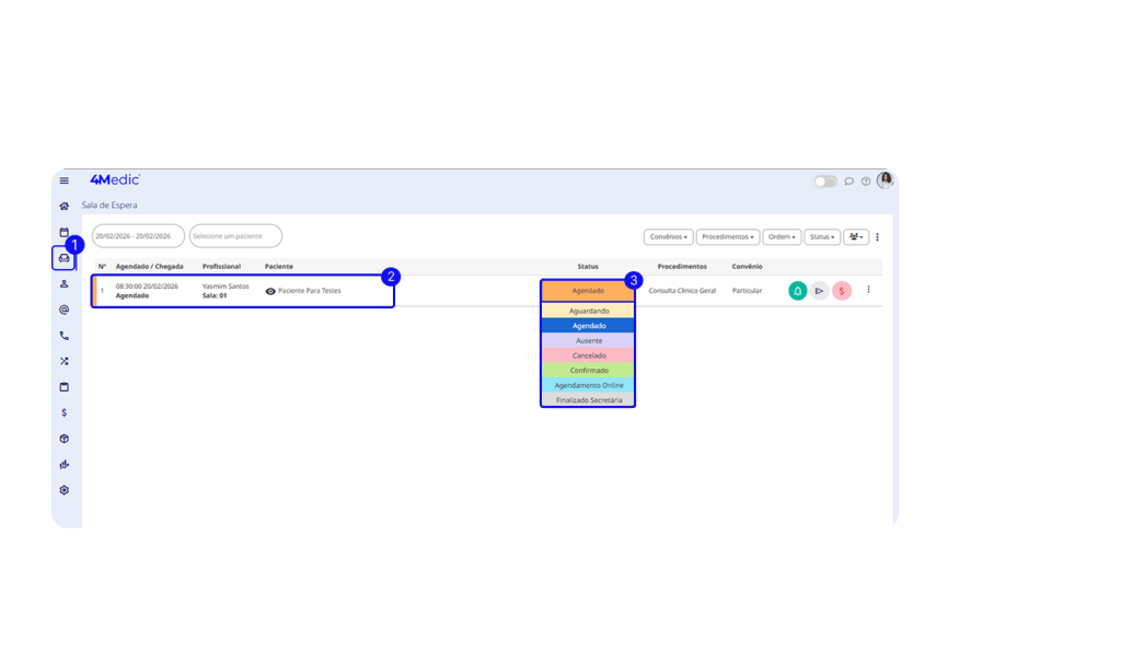 1. No menu lateral esquerdo, clique em Sala de Espera (ícone de sofá).
