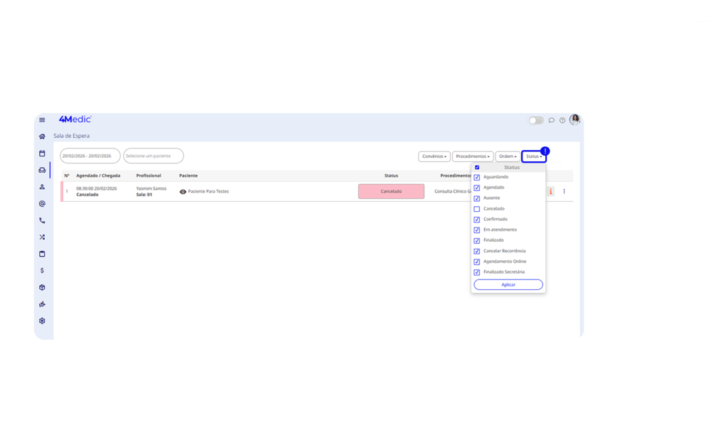 • Caso não deseje visualizar os agendamentos cancelados na sala de espera, basta retirar do filtro “status” a opção cancelado.
