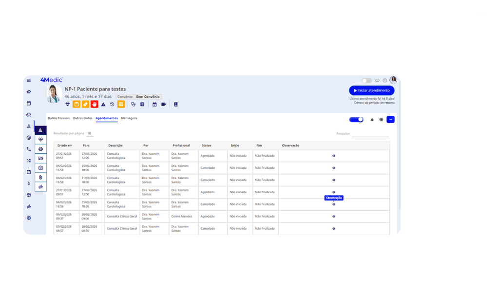• A Justificativa do cancelamento, também poderá ser visualizada no histórico de agendamento dentro do prontuário no ícone 👁️.