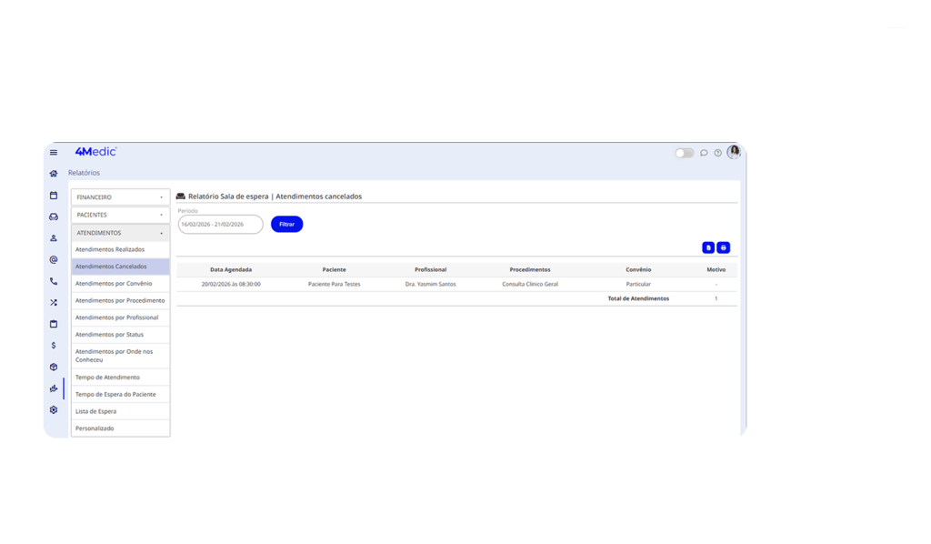 • Ou em relatórios, você também poderá ter acesso completo aos atendimentos cancelados e as justificativas, acesse: relatórios > atendimentos > atendimentos cancelados.