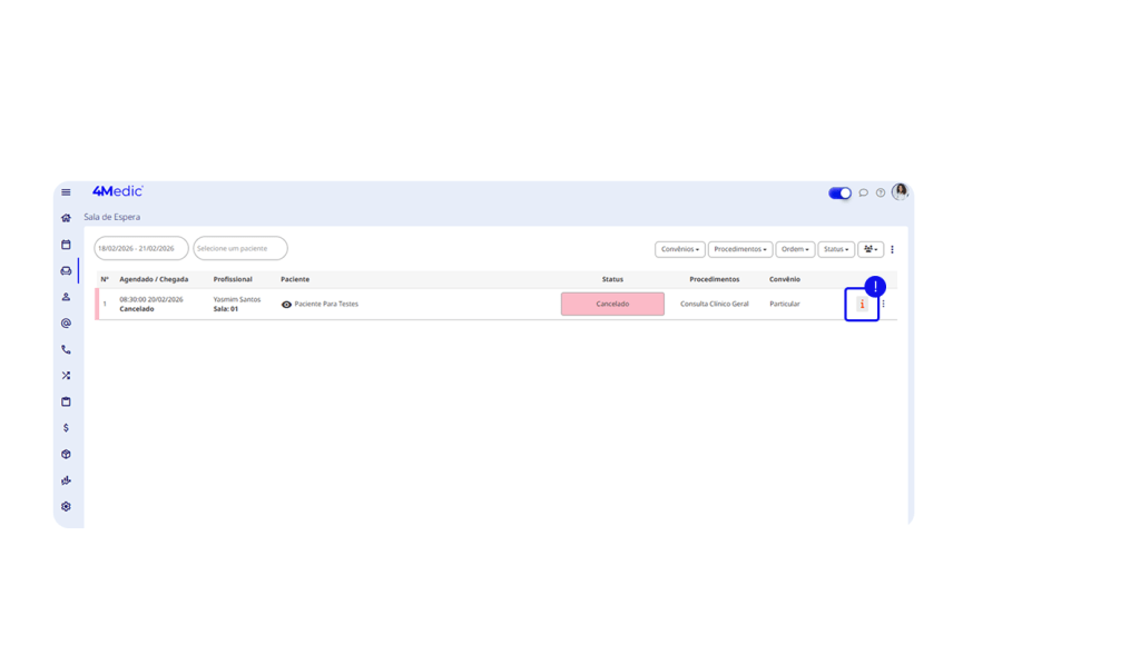 • A Justificativa do cancelamento, poderá ser visualizada na sala de espera no ícone de ℹ️
