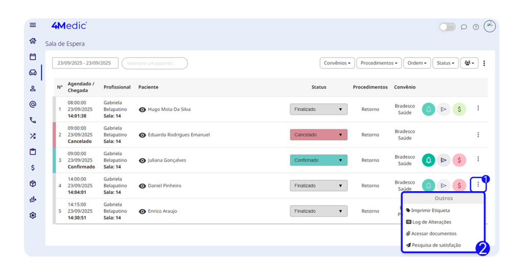 Após identificar o agendamento, sempre que houver atualizações relacionadas ao paciente, você poderá alterar o status utilizando as opções disponíveis, como: