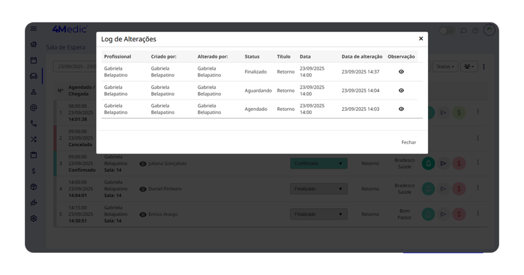 - Sala de Espera: Identifique o agendamento e clique em Status, em seguida basta atualizá-lo.