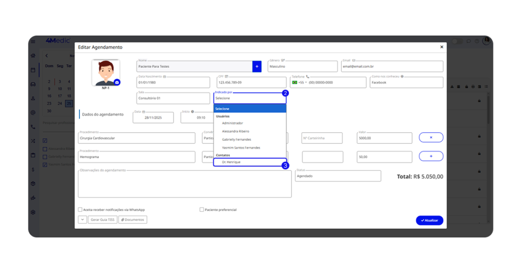 Você pode vincular um contato ao agendamento para registrar quem indicou o paciente.