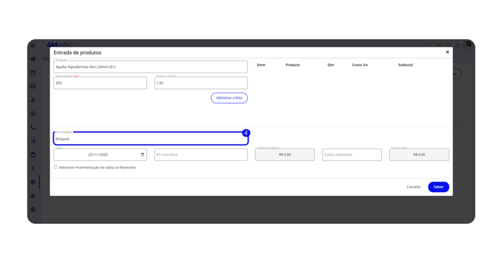 4. Preencha as informações e, no campo Fornecedor, selecione o contato cadastrado.