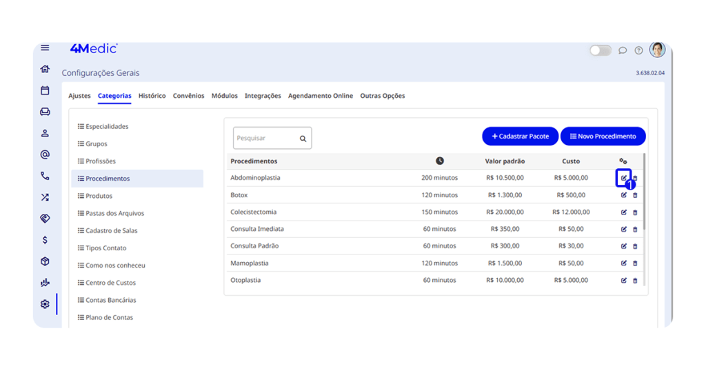 1. Localize o procedimento que deseja editar e clique no ícone de edição (lápis ✏️).