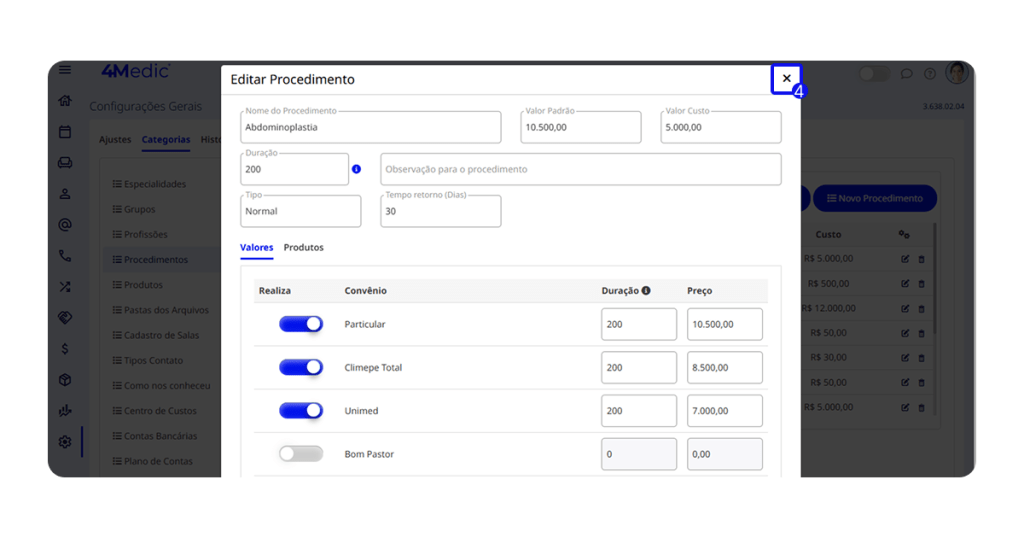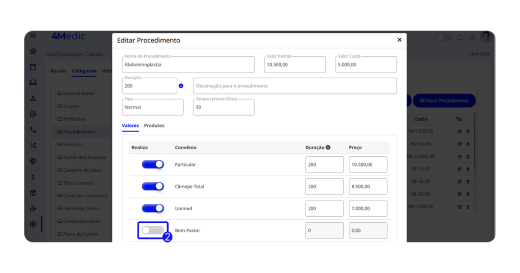 Com esse processo simples, você consegue habilitar convênios nos procedimentos e definir valores personalizados, garantindo mais controle e precisão nos atendimentos.