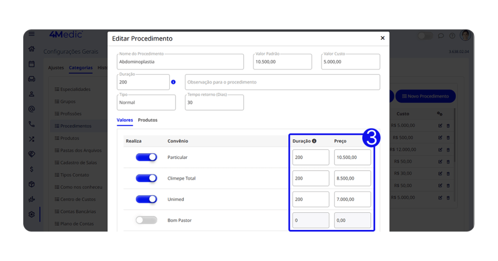 3. Caso necessário, ajuste as coluna Preço e a Duração do procedimento conforme o convênio selecionado.