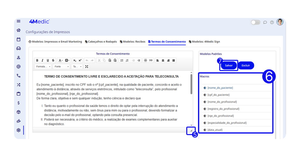 - Na seção “Termos de Consentimento”, a 4Medic disponibiliza um termo padrão.