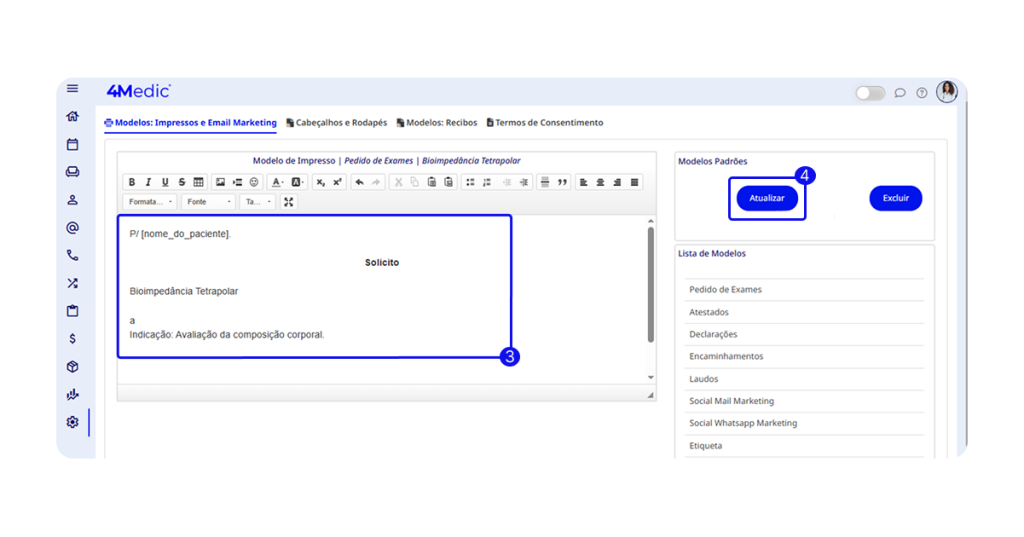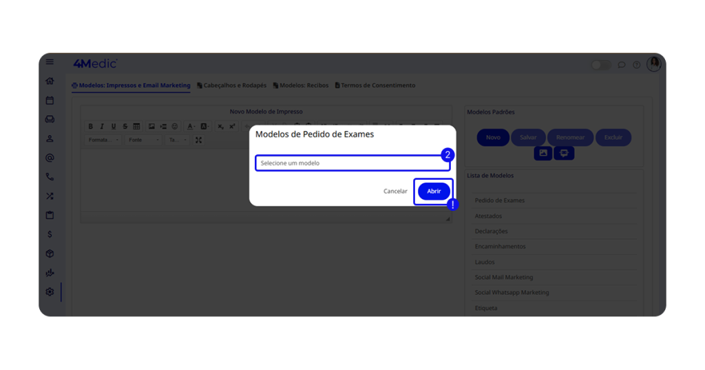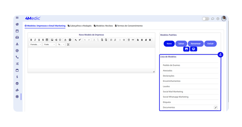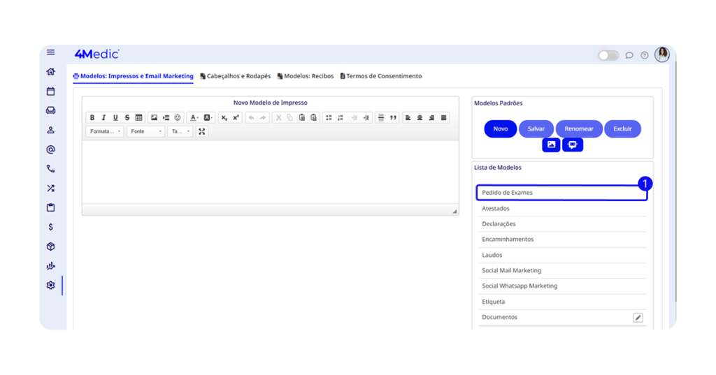 Neste tutorial, você irá aprender como editar um modelo de impresso dentro da plataforma 4Medic, permitindo personalizar documentos conforme as necessidades da sua clínica ou dos profissionais de saúde.