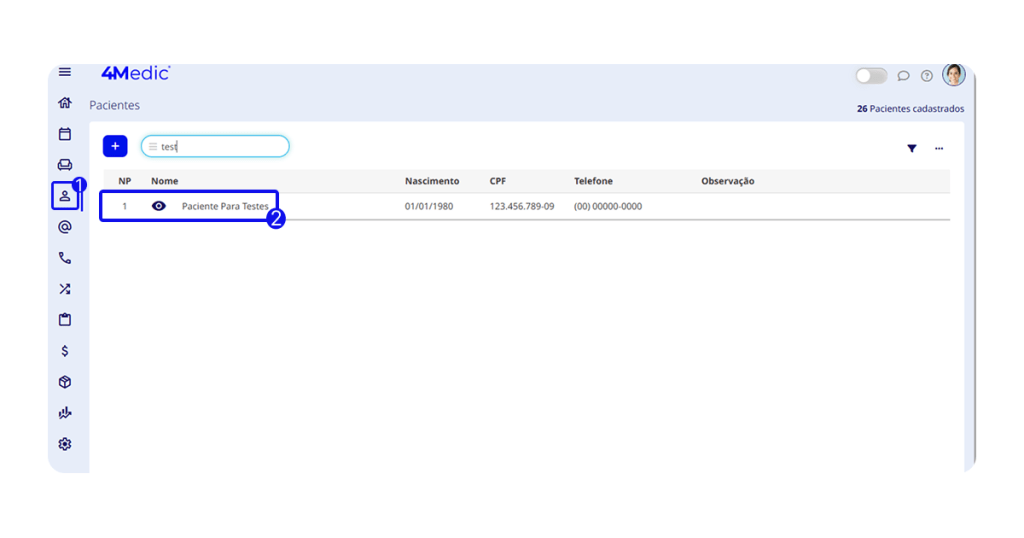 1. No menu lateral esquerdo, clique em Pacientes.