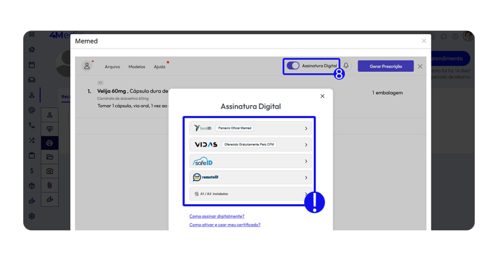 Caso deseje que as prescrições saiam assinadas digitalmente, ative a assinatura seguindo o passo a passo: