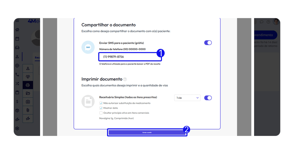 1. No campo Número de telefone, informe o telefone do paciente. O envio por SMS é realizado gratuitamente pela Memed.