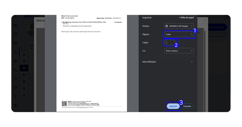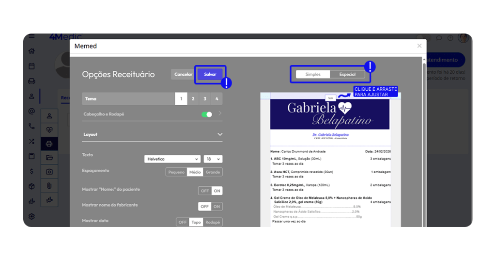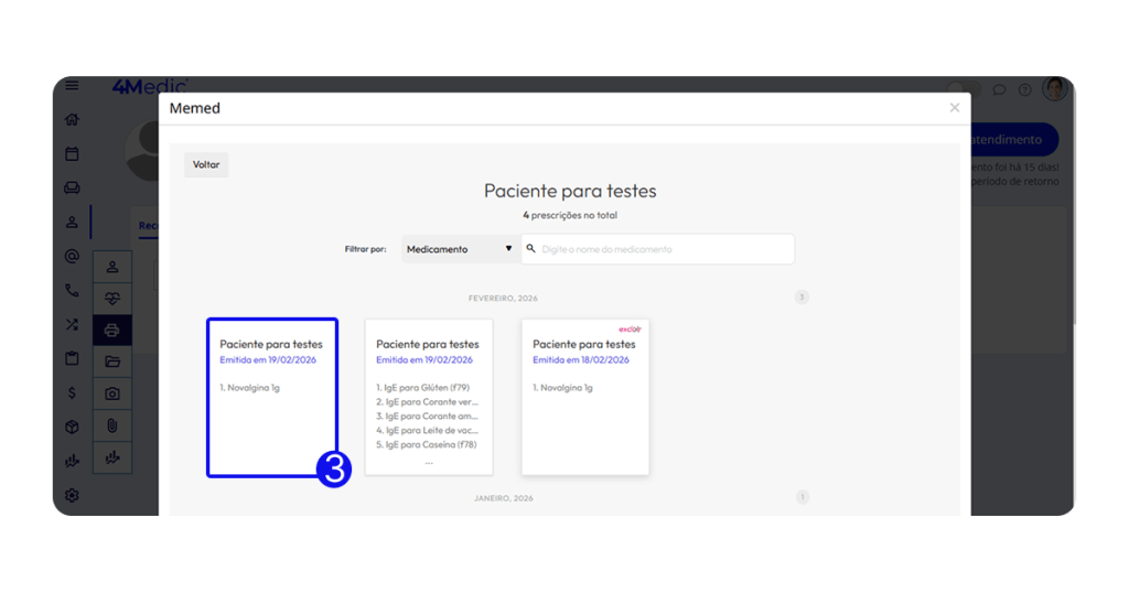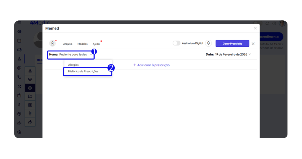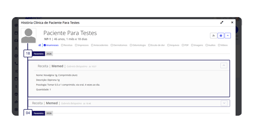 • As prescrições ficam salvas na História Clínica do 4Medic.