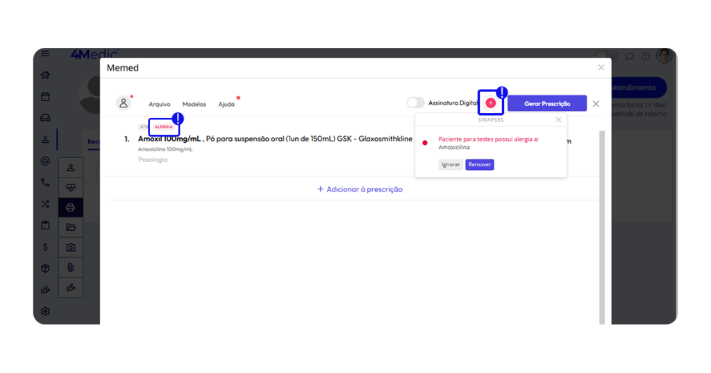 3. Ao adicionar um medicamento ao qual o paciente seja alérgico: