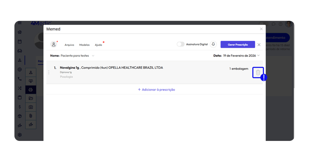 • 󠁯Caso deseja excluir o medicamento, clique no icone de lixeira.