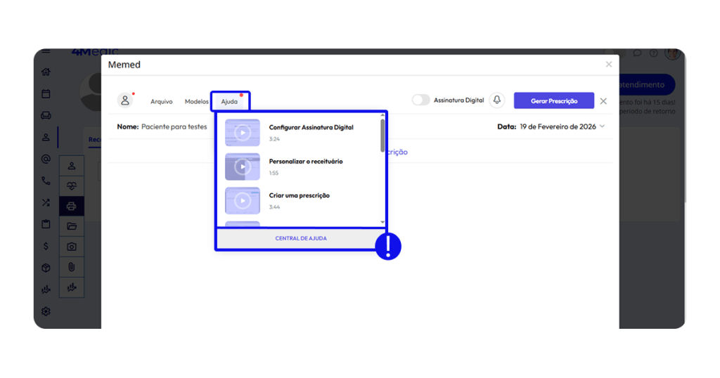 💡 Dica: Caso tenha dúvidas quanto às funcionalidades da plataforma Memed acesse a Central de Ajuda, no menu superior esquerdo.