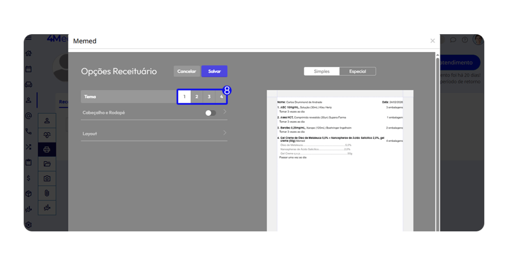 8. Escolher o tema do receituário: Clique nas opções 1, 2, 3 ou 4 para selecionar o modelo desejado.