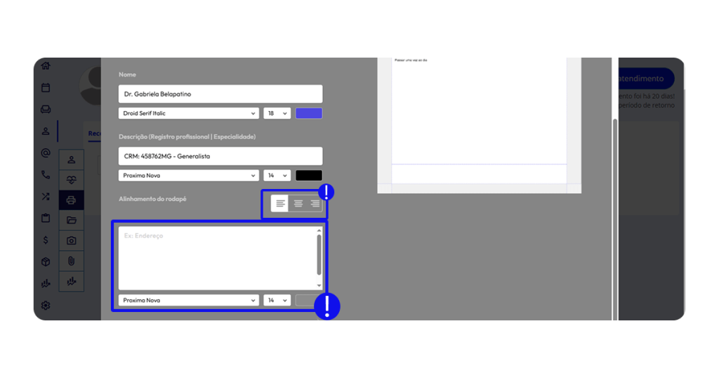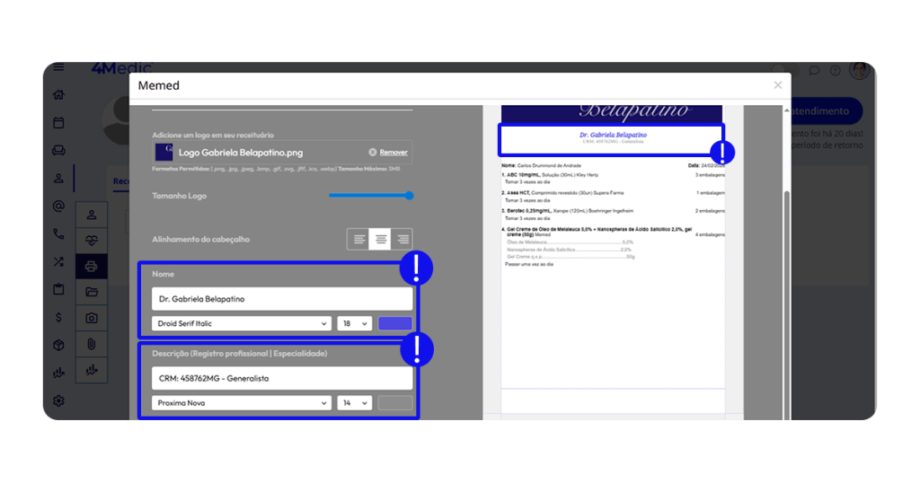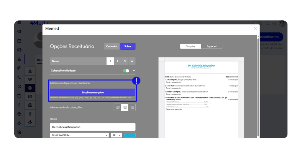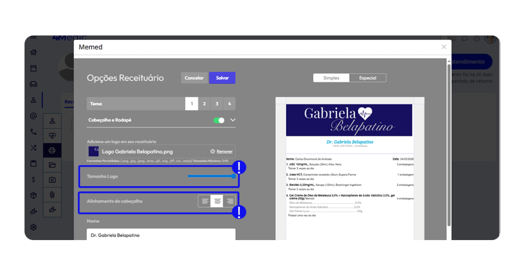 Essas configurações garantem que o receituário siga a identidade visual da clínica.