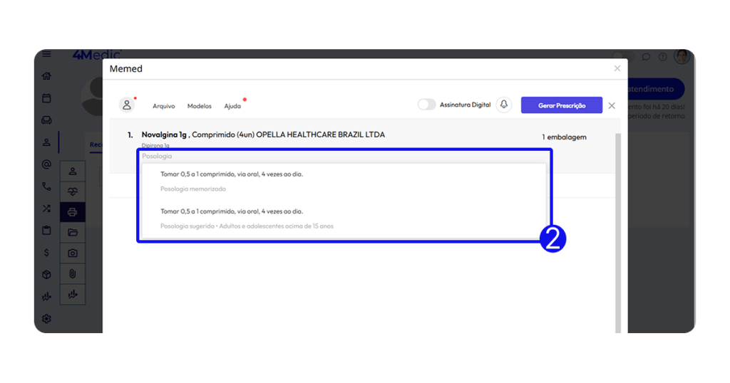 2. Informe a quantidade e a posologia. O sistema pode sugerir opções padrão, porém é possível personalizar.