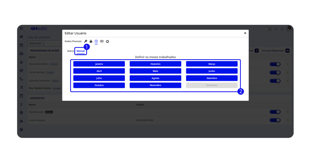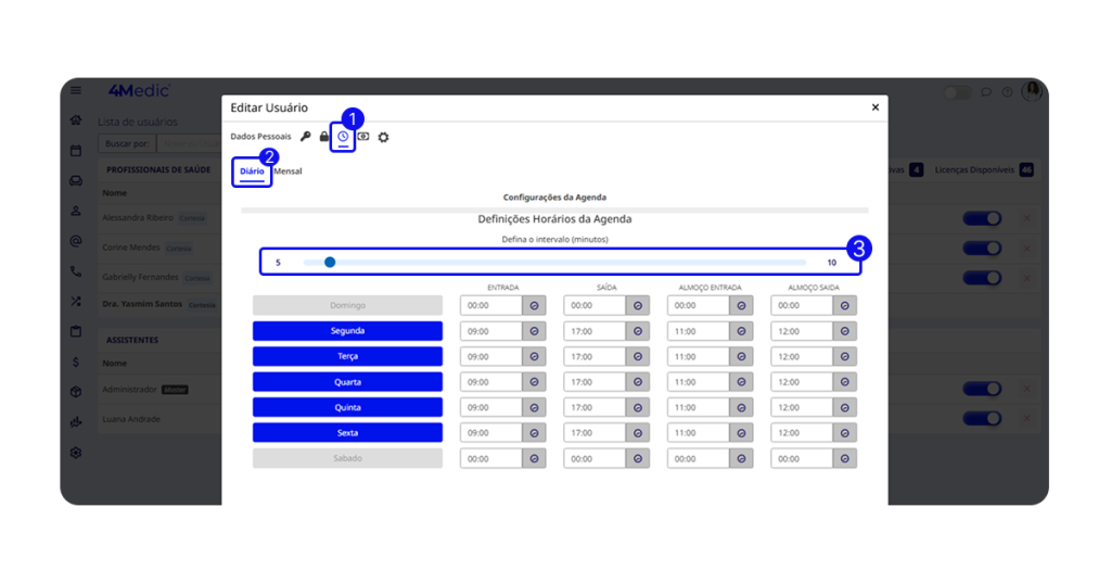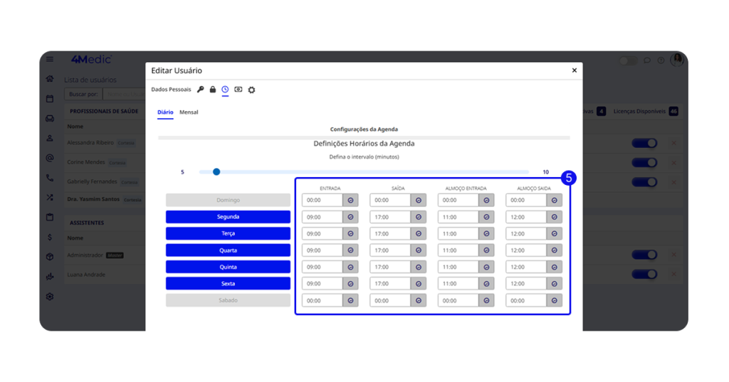4. No lado esquerdo da tela, selecione os dias de trabalho do profissional: