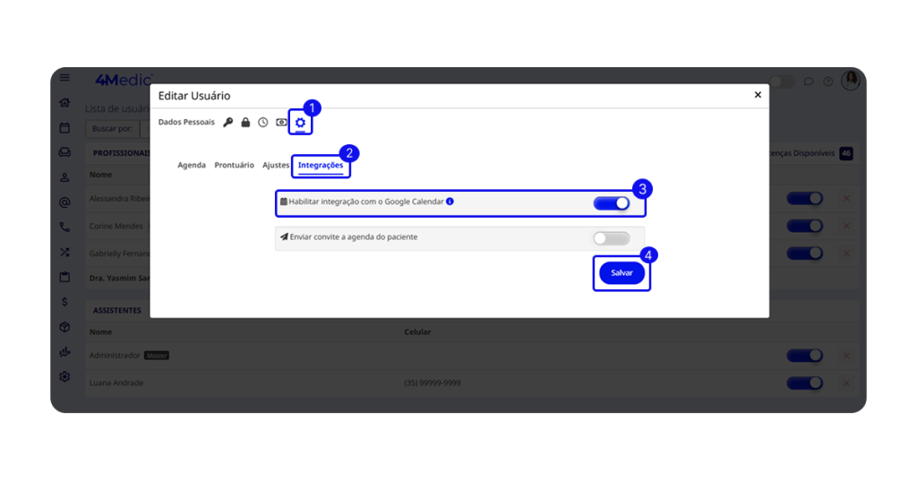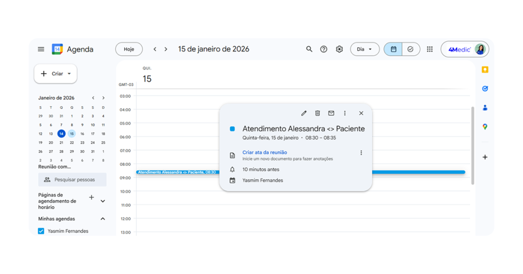- Todos os novos agendamentos realizados dentro do 4Medic serão sincronizados automaticamente com o Google Agenda.