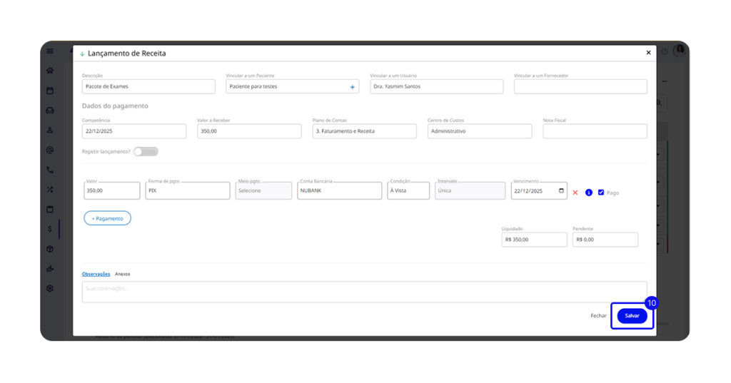 Com esse processo simples, você consegue lançar e gerenciar suas receitas manualmente, garantindo controle total das entradas financeiras da clínica. Sempre que necessário, repita esses passos e mantenha as informações organizadas para uma gestão mais eficiente.