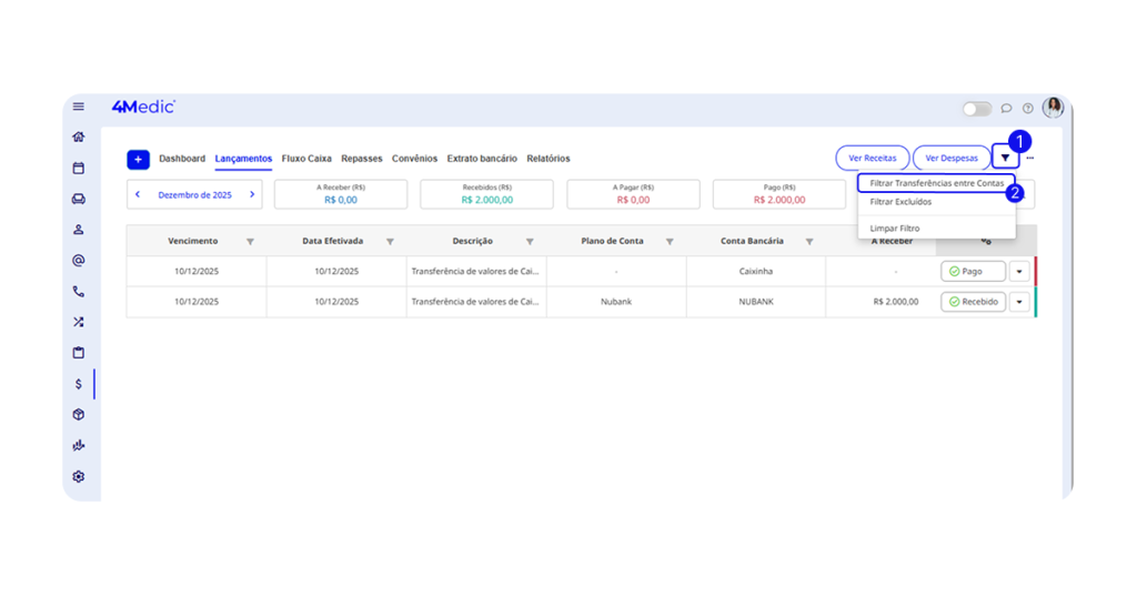 2. Selecione a opção “Filtrar Transferências entre Contas”.