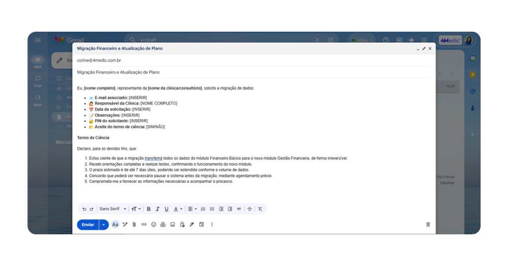 - A 4Medic enviará um e-mail para agendar uma data e um horário para a migração. Neste horário, a assinatura ficará pausada por cerca de 60 minutos