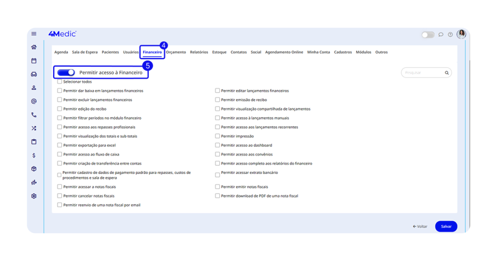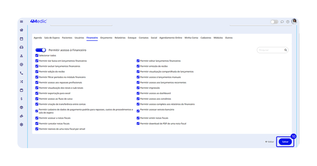 5. Ative a chave “Permitir acesso à Financeiro”.