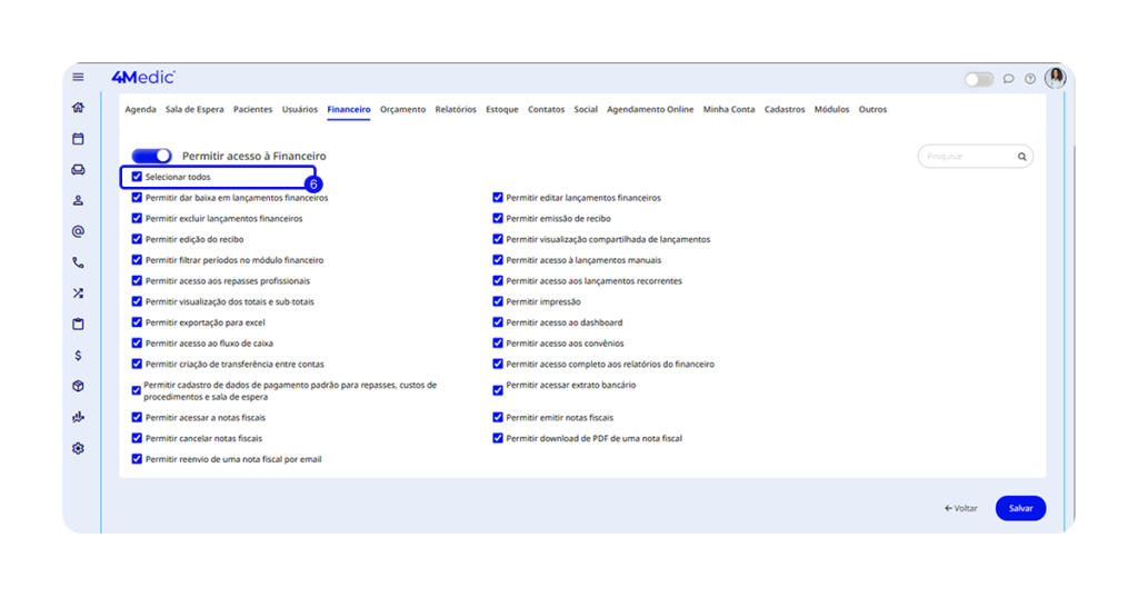 6. Clique em “Selecionar todos” para liberar todas as funcionalidades do módulo.