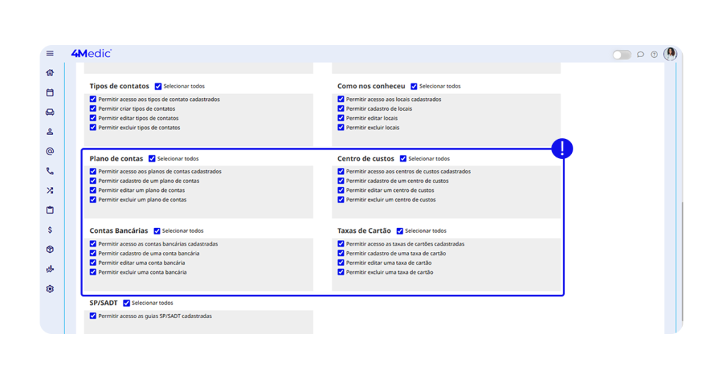 8. Em seguida, nas abas Plano de Contas, Centro de Custos, Contas Bancárias e Taxas de Cartão, clique em Selecionar todos para liberar o acesso completo.
