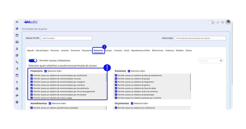 9. Depois, acesse Relatórios e libere todas as opções, clicando em Selecionar Todos: em Financeiro