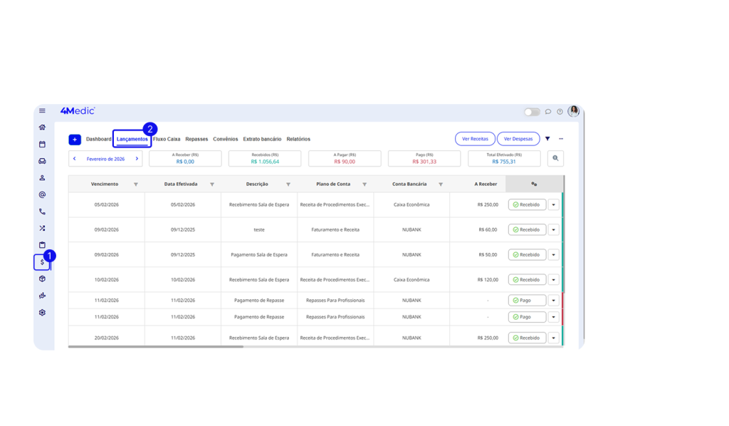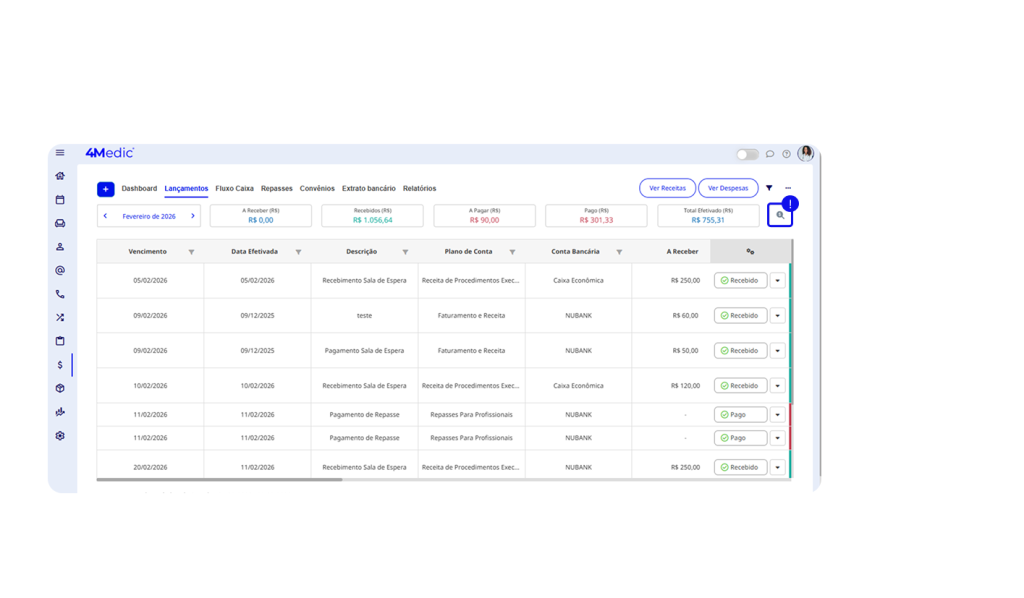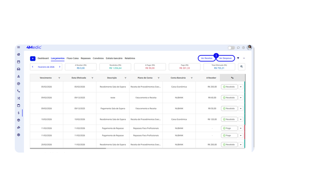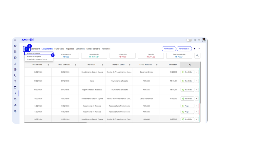 Além dos recebimentos automáticos da Sala de Espera, é possível lançar receitas e despesas manualmente.