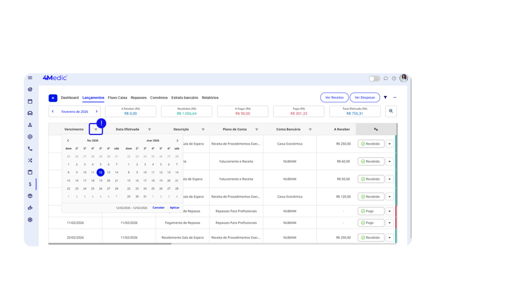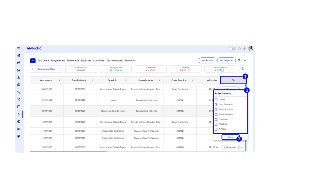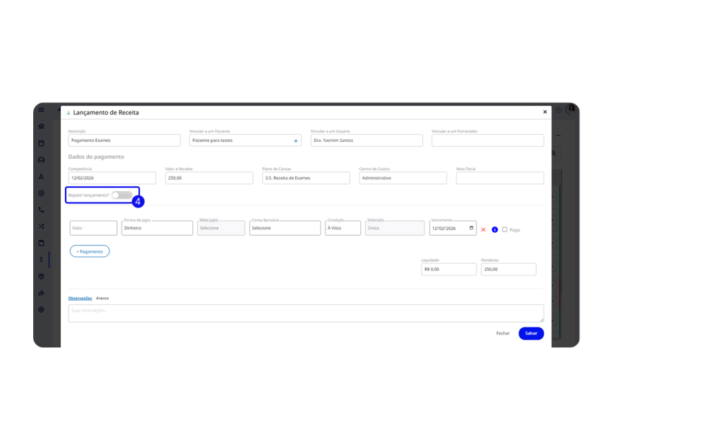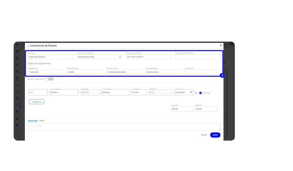 Com esse processo simples, você consegue visualizar, registrar e gerenciar receitas, despesas e transferências, garantindo um controle financeiro organizado e confiável. Sempre que necessário, repita esses passos e mantenha o fluxo de caixa da sua clínica atualizado.