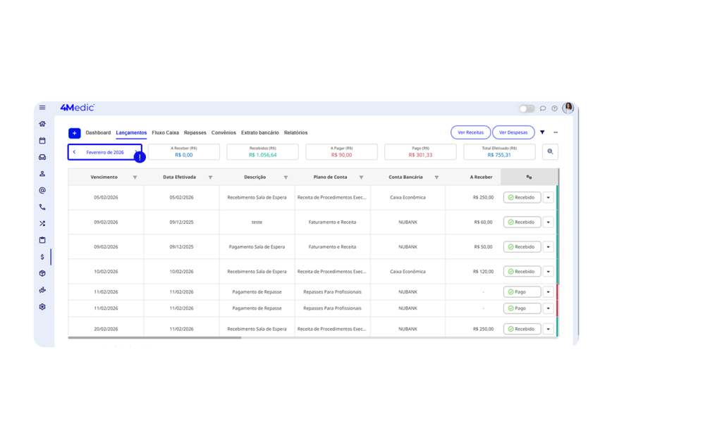 Neste tutorial, você irá aprender como visualizar, registrar e gerenciar lançamentos financeiros, incluindo receitas, despesas e transferências entre contas na plataforma. Com essas funcionalidades, você mantém um controle financeiro preciso da sua clínica, organiza o fluxo de caixa e facilita a tomada de decisões.