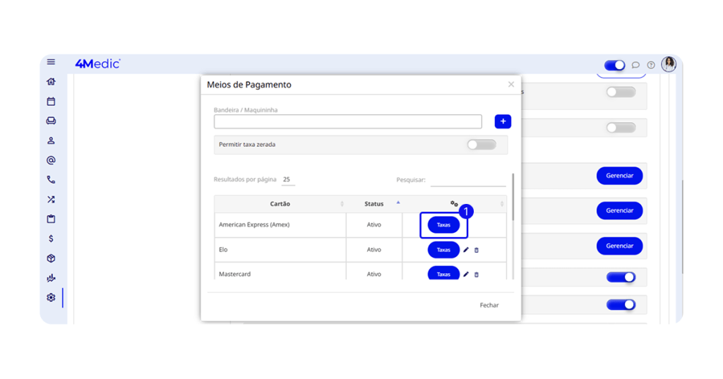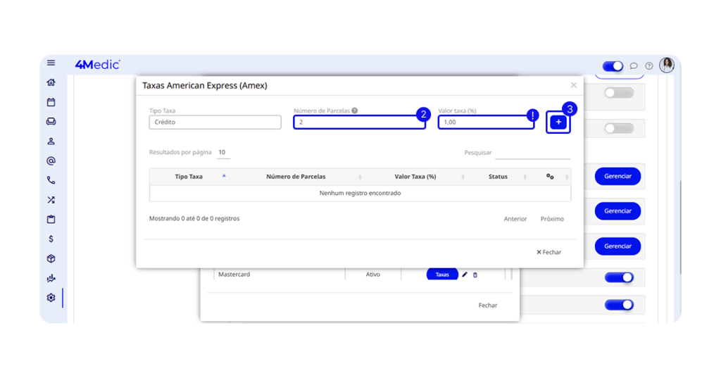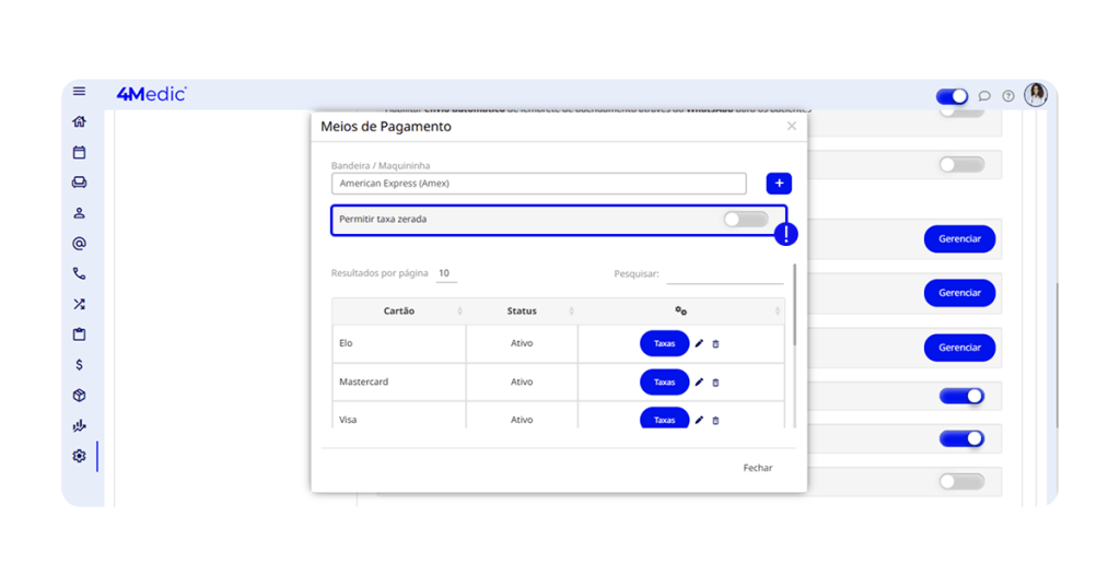 Com essa configuração, o sistema desconta automaticamente a taxa do valor recebido do paciente, garantindo mais precisão no controle financeiro.
