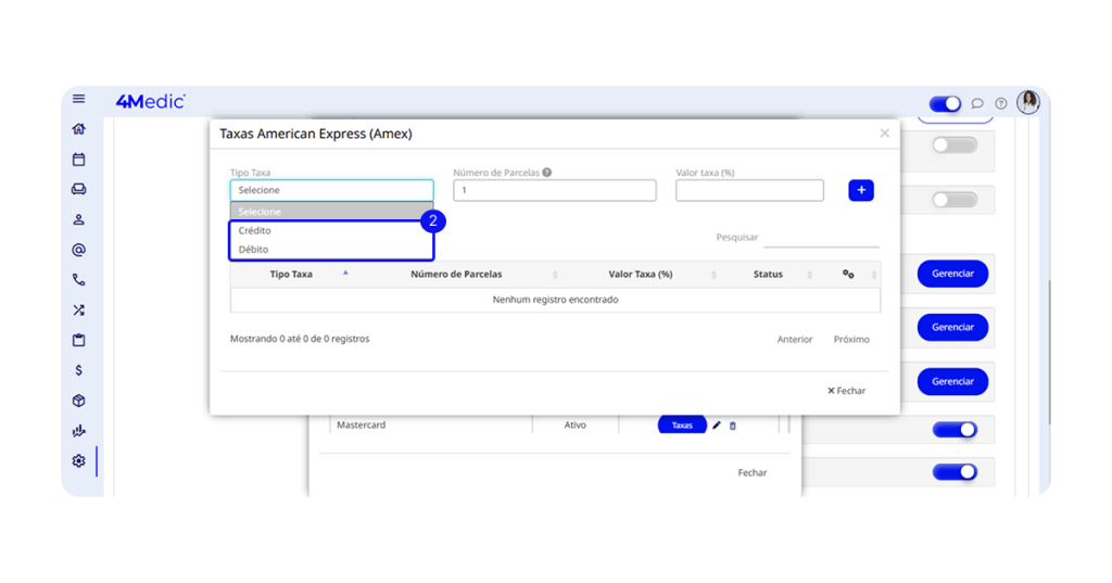Nesta etapa, você poderá cadastrar de forma personalizada as taxas de cartão, configurando por maquininha, bandeira e parcelamento.