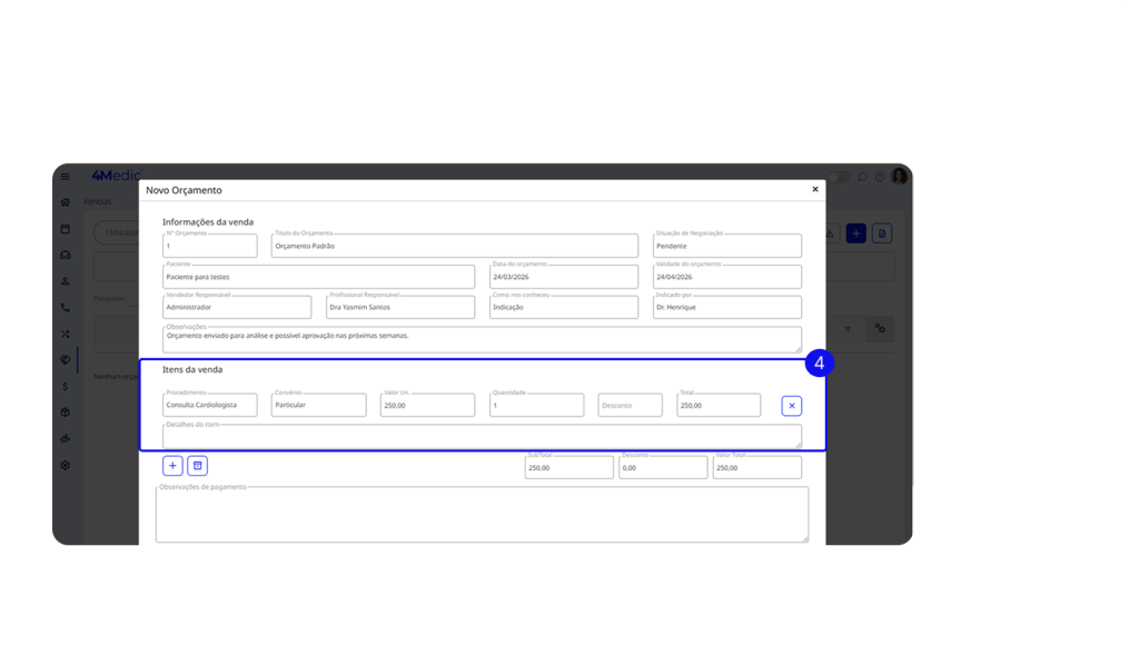 4. Em Itens da venda, inclua procedimentos avulsos: