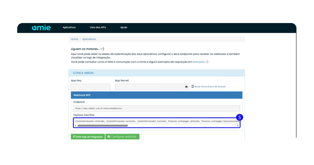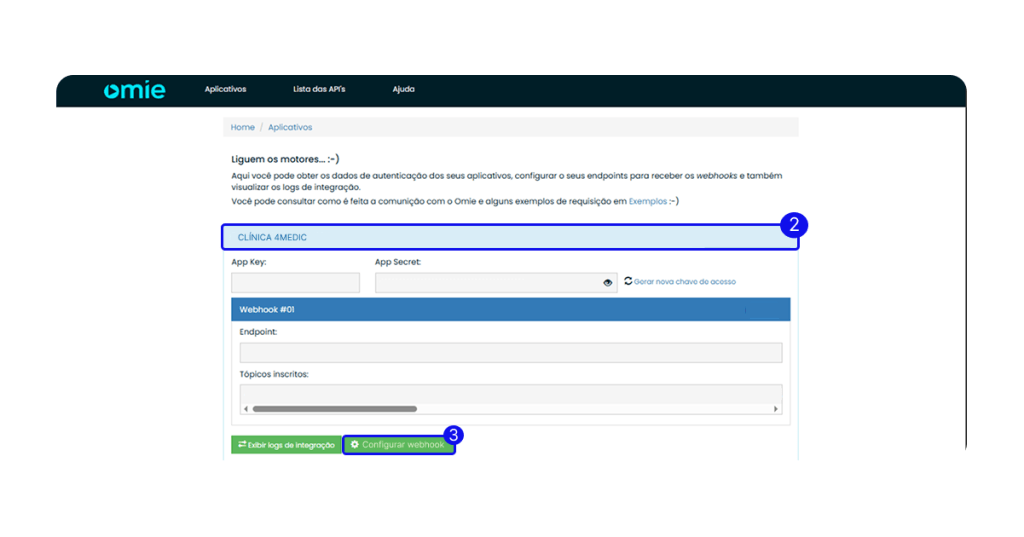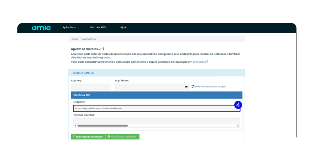 4. No campo Endpoint, adicionar o endereço: https://app.4medic.com.br/omie/omieRetorno