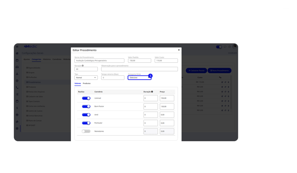 ⚠️ Importante: Todas as categorias e contas correntes devem estar cadastradas previamente no OMIE para aparecerem como opções no 4Medic.