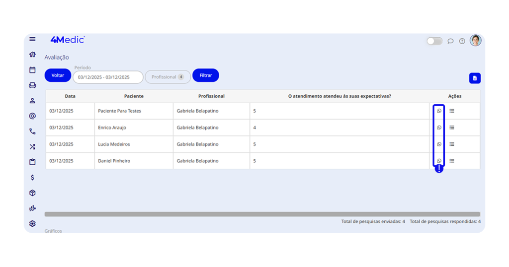 Mais do que apenas coletar dados, é fundamental que a clínica ou consultório mantenha um relacionamento próximo com seus pacientes, fortalecendo vínculos, demonstrando escuta ativa e oferecendo retorno aos feedbacks recebidos. Para isso, clique no ícone de WhatsApp e entre em contato com seu paciente!