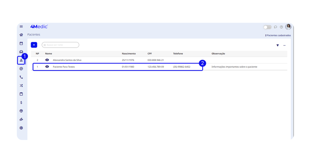 1. No menu lateral esquerdo, clique na aba Pacientes.