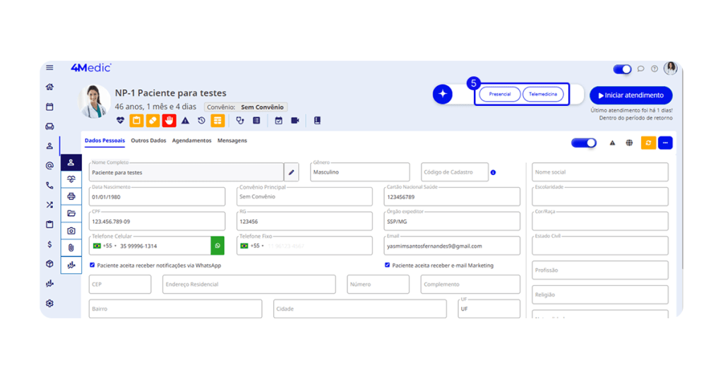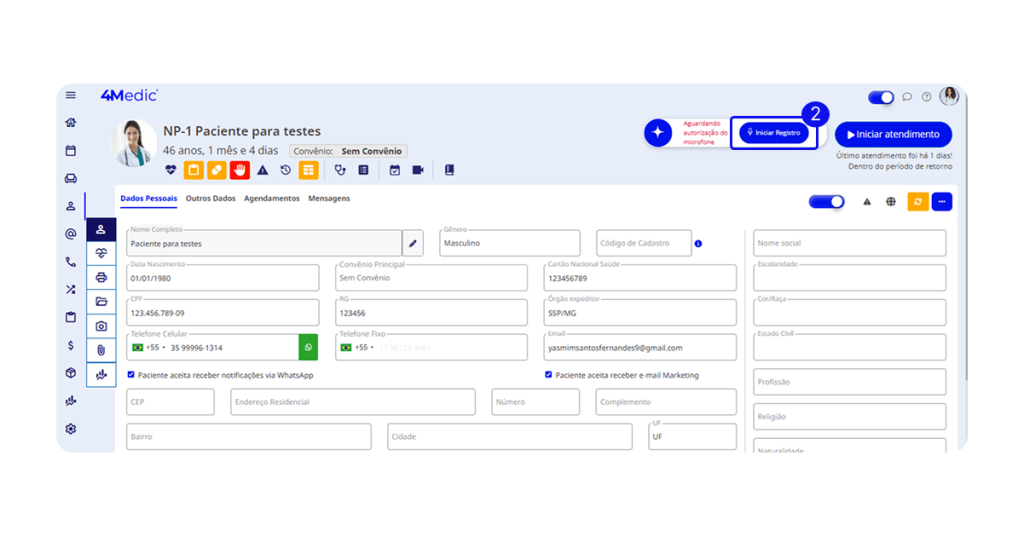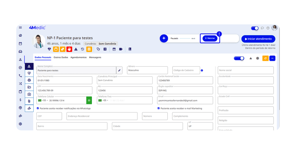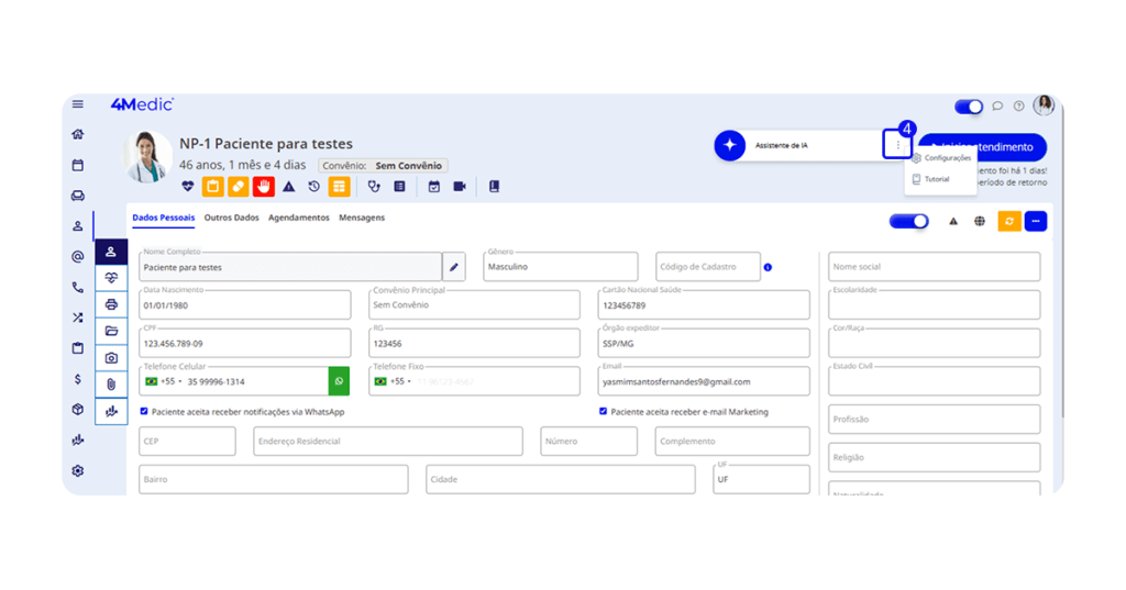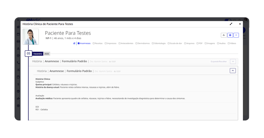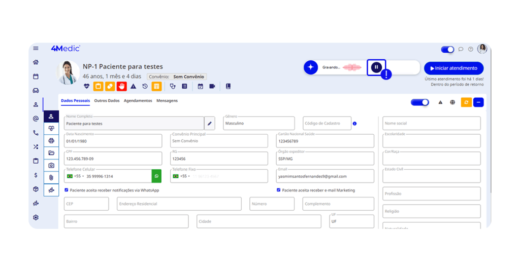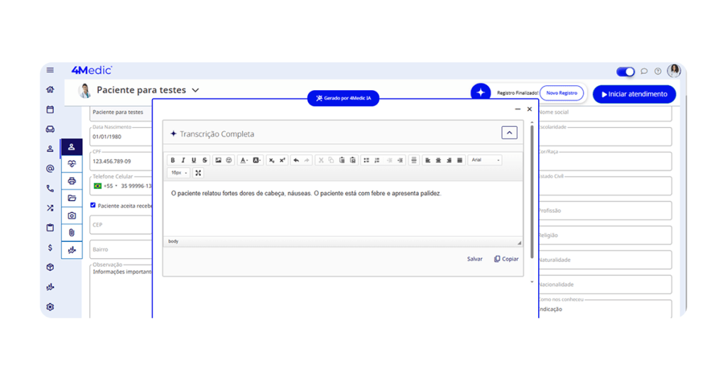 Com esse processo simples, você consegue registrar atendimentos com mais agilidade, padronização e segurança, aproveitando todo o potencial do 4Medic IA. Sempre que necessário, repita esses passos e mantenha o prontuário completo e organizado.