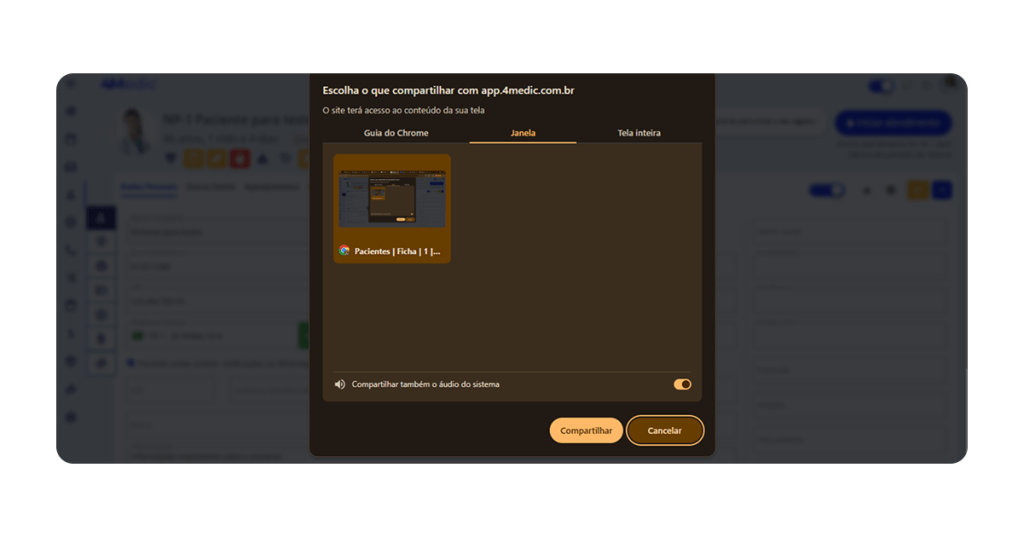 - Caso selecione Telemedicina: Para realizar o registro, você deve compartilhar o áudio da guia do navegador na qual a consulta será realizada.