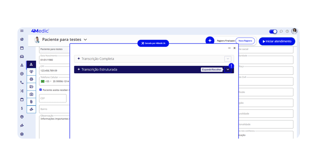 Neste tutorial, você aprenderá a utilizar o 4Medic IA durante os atendimentos, realizando a gravação, transcrição automática e organização das informações diretamente no prontuário do paciente.