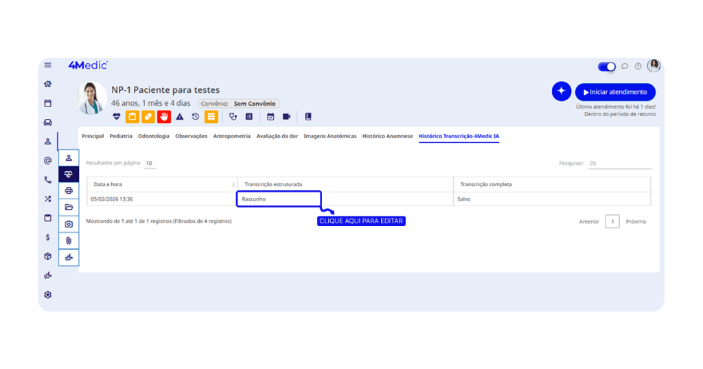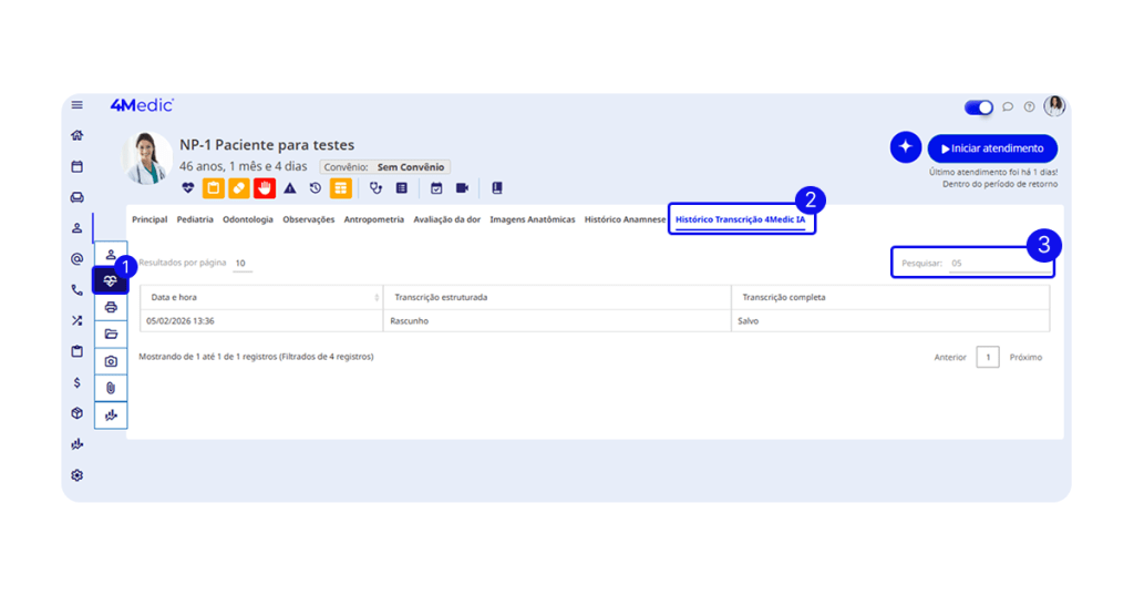 5. As transcrições salvas também podem ser visualizadas na História Clínica, acessando o menu abaixo do nome do paciente (ícone de coração ❤️).