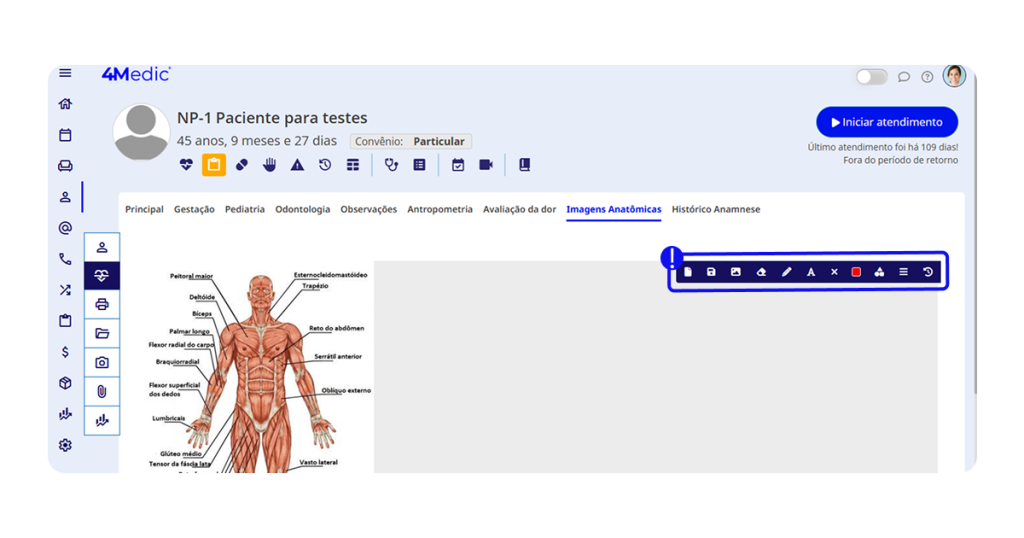 Neste tutorial, você aprenderá como utilizar o módulo de Imagens Anatômicas para registrar informações clínicas diretamente em imagens adicionadas por você, de acordo com sua especialidade. Com esse recurso, é possível desenhar, adicionar textos, editar e salvar anotações na história clínica do paciente, garantindo um acompanhamento visual e detalhado da avaliação.